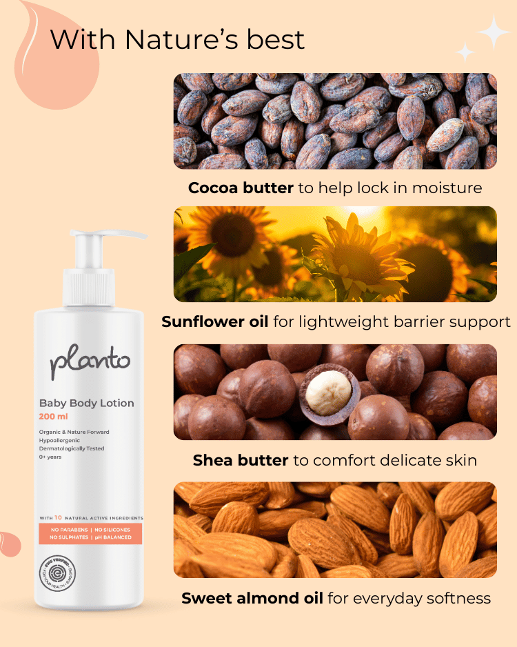 Take Planto Baby Body Lotion in your palm and rub both palms together to warm the lotion. Treat your little sweetheart to some tender care by gently massaging it onto their precious skin in small circles until it soaks in, leaving them feeling oh-so-soft and snuggly.